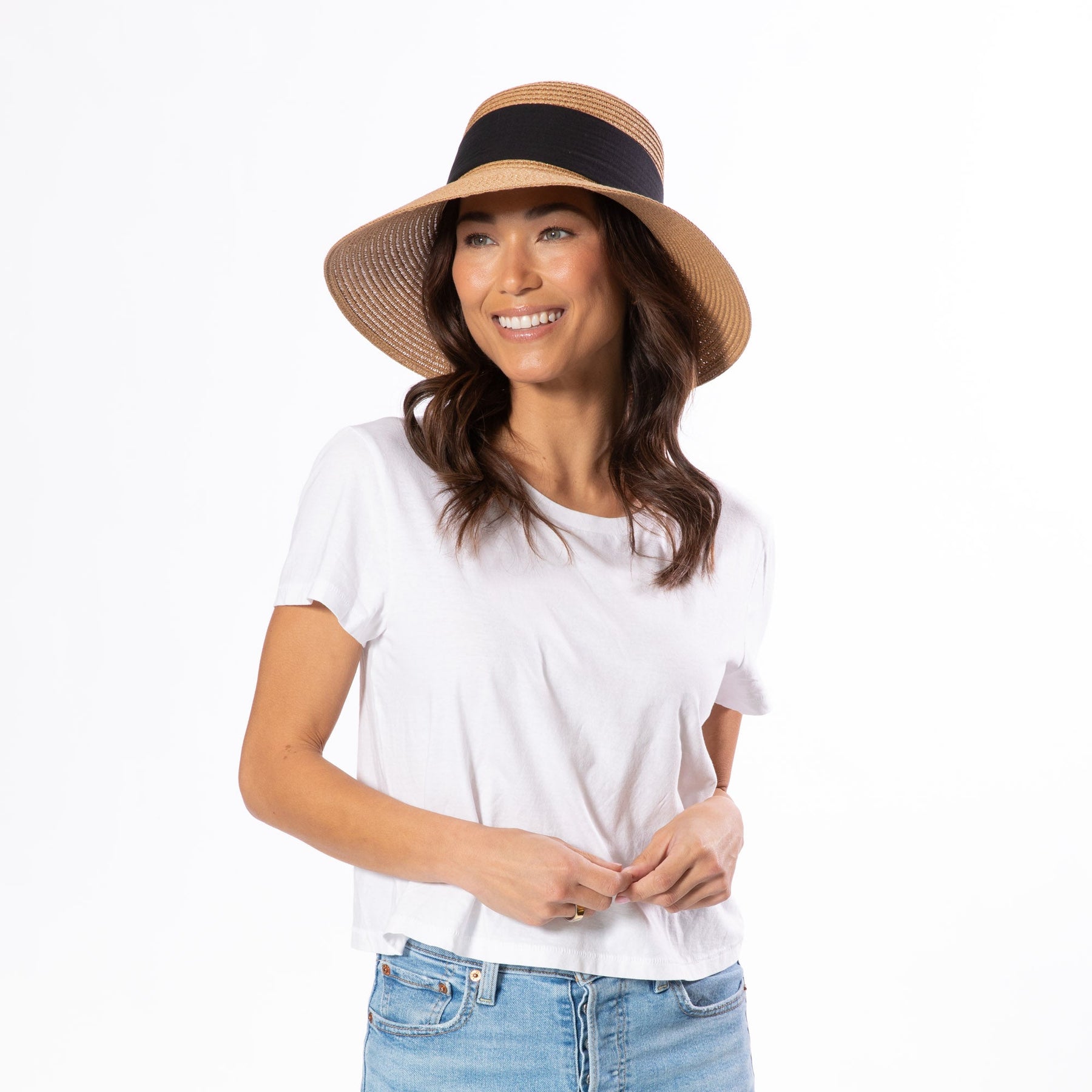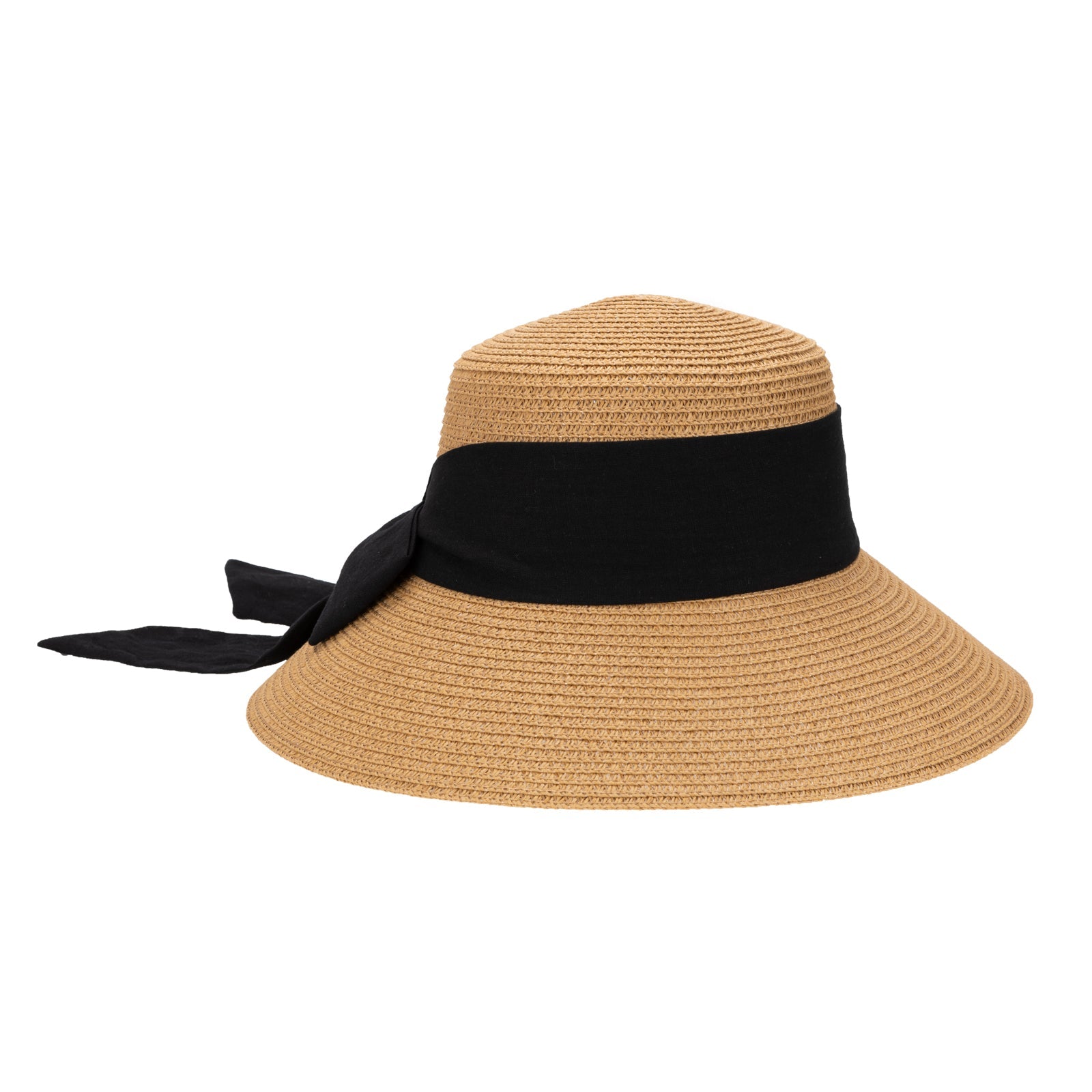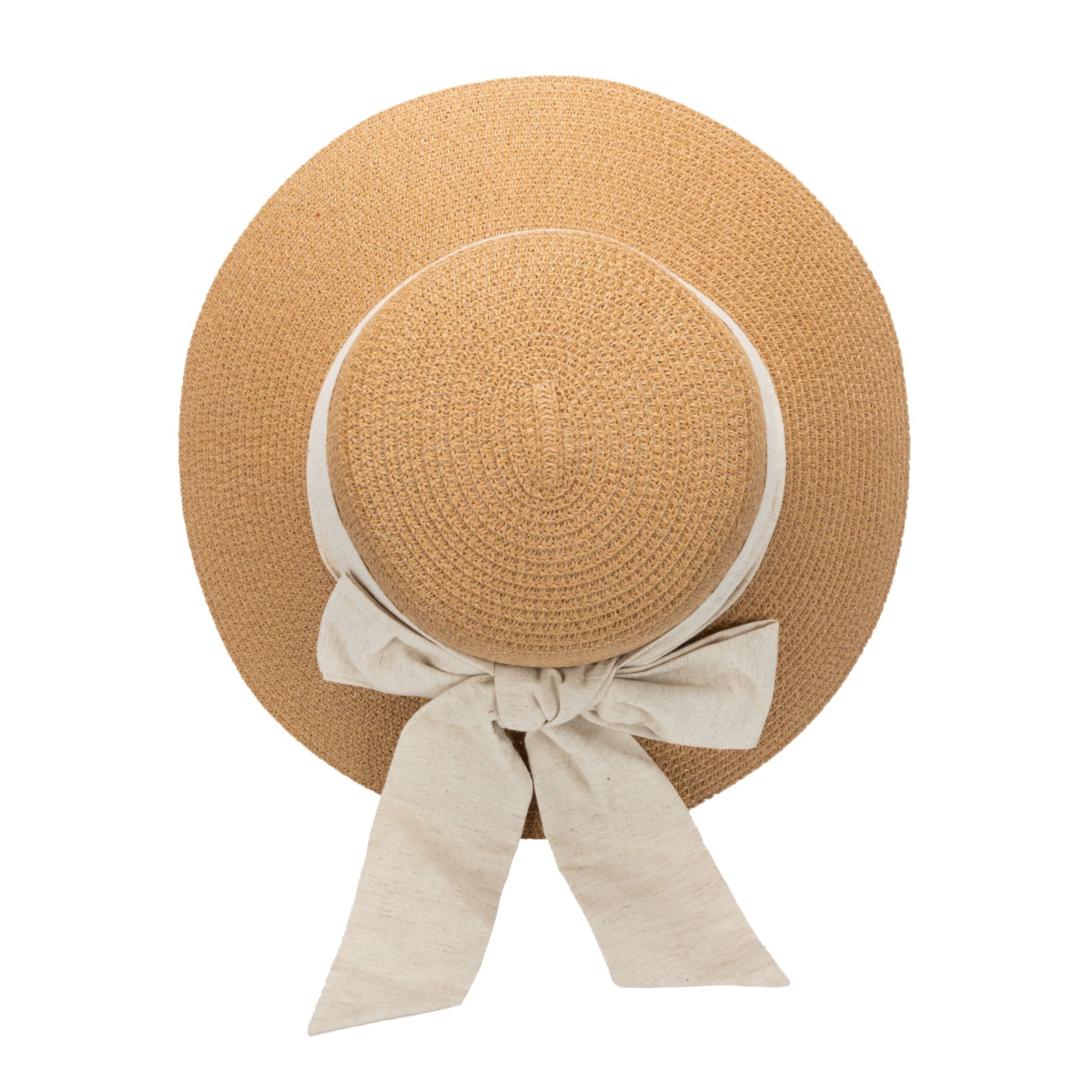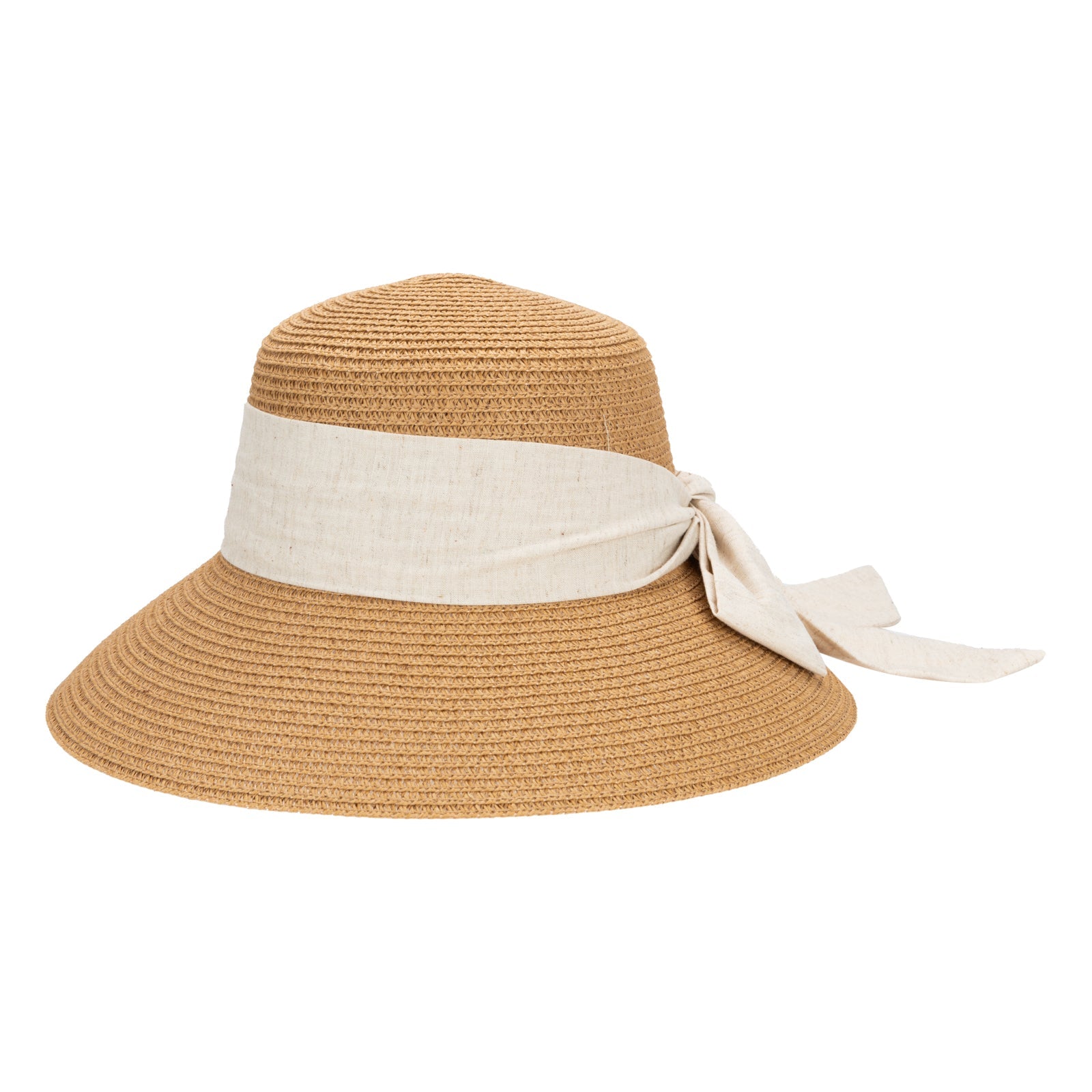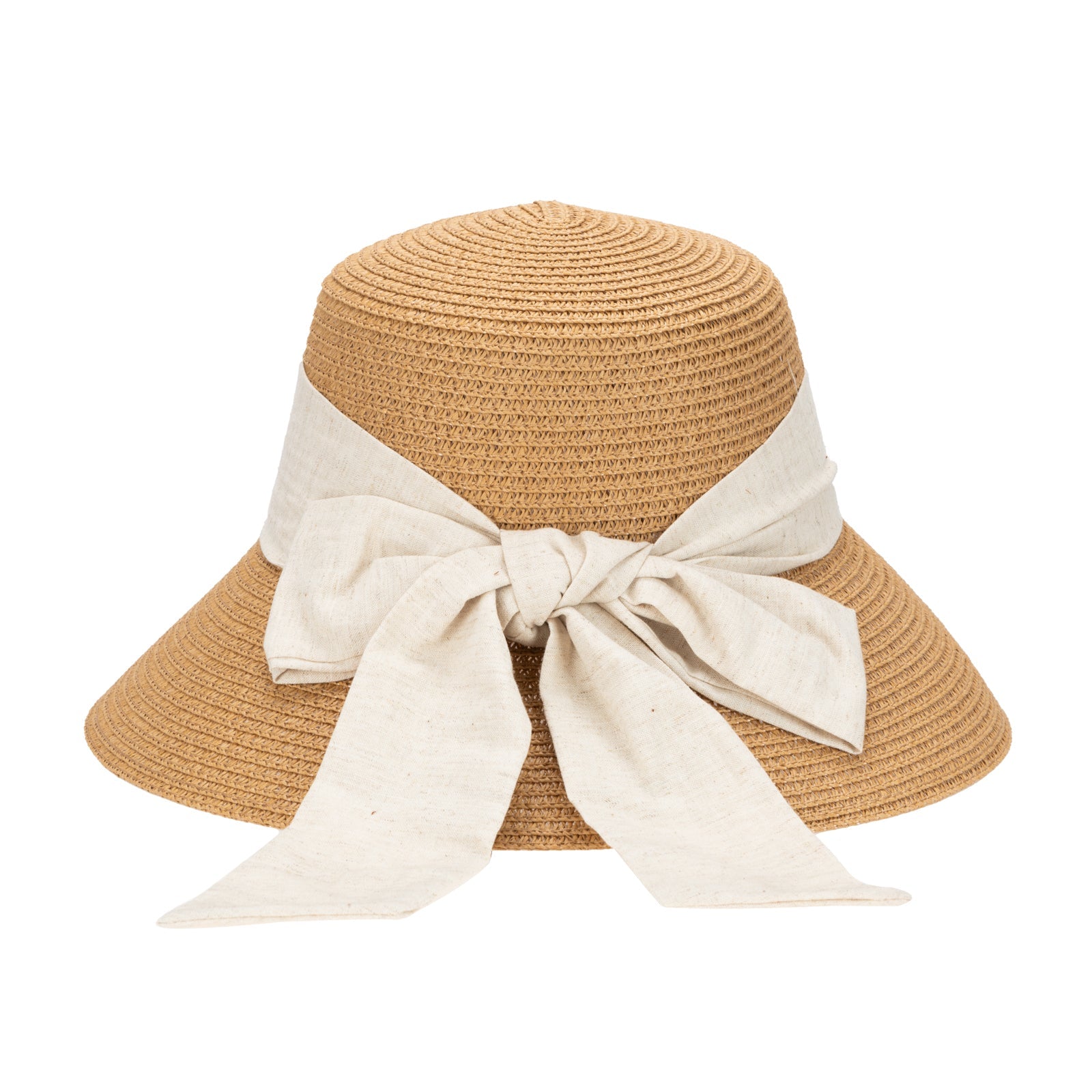 Lightweight paper braid construction paired with a structured linen band, finished with a centered back bow for refined, understated elegance.