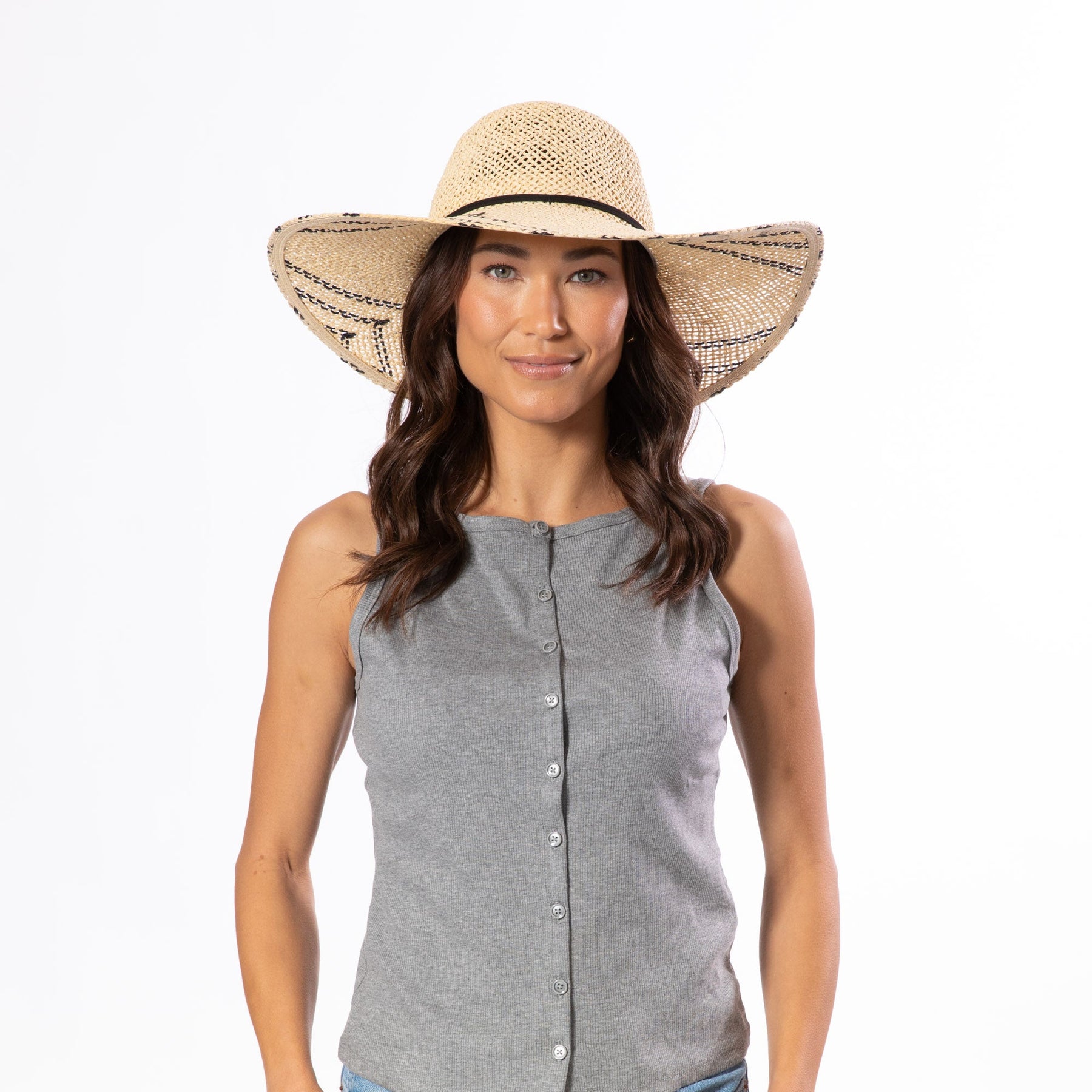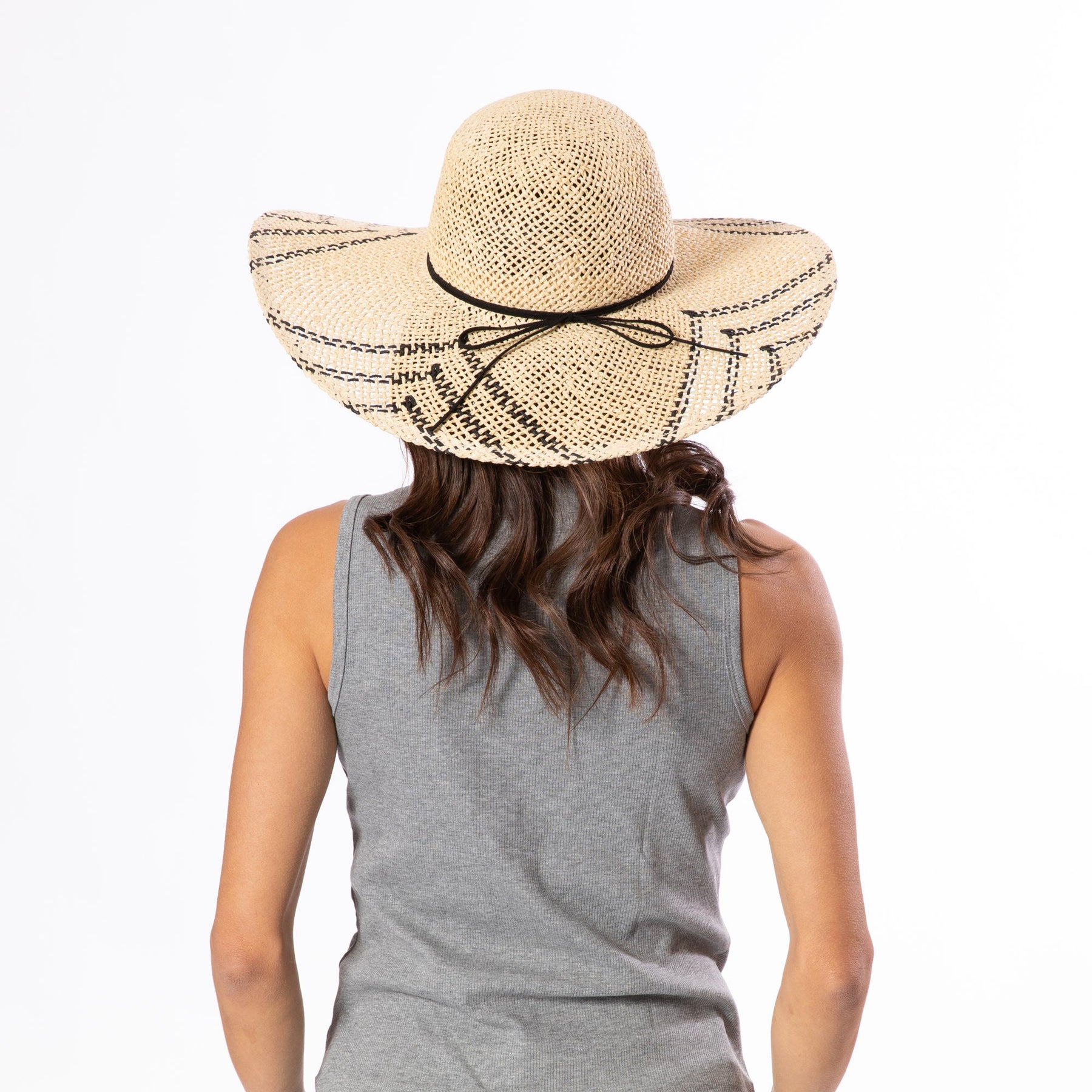 Handcrafted paper crochet construction defines this round crown silhouette, distinguished by a contrasting brim pattern and finished with faux suede cording secured at the back. A refined choice for those seeking structured elegance with artisanal detail.